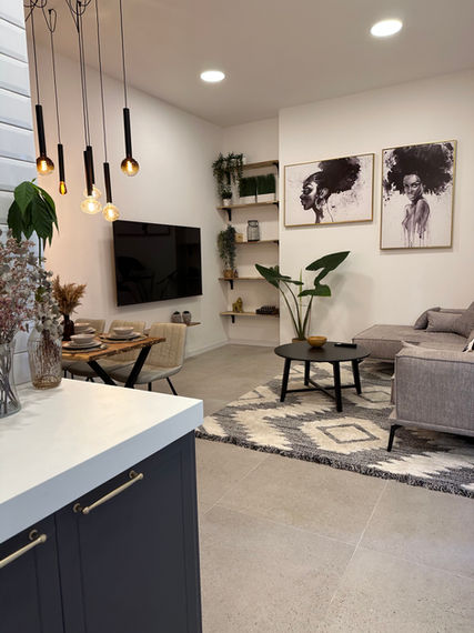 הפרוייקט כלל דירת קבלן, צרה וארוכה, אותה רכשו הלקוחות בשלב יחסית מאוחר והיה ניתן לבצע בעיקר שינויי חשמל ובחירות חומרים.